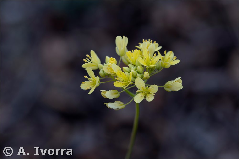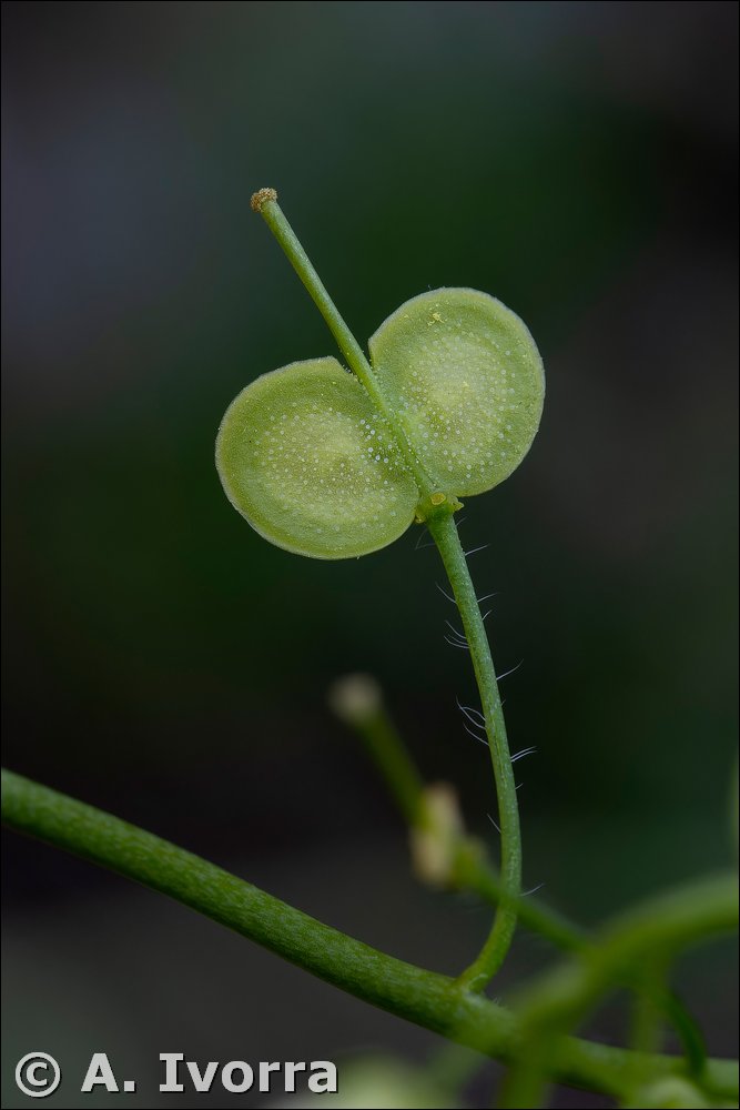 amplexicaules; todas de color verde intenso, frecuentemente con tintes violáceos, glabrescentes o con pelos cortos. Inflorescencia ebracteada, laxa; racimos alargados en la fructificación. Flores actinomorfas, hermafroditas, tetrámeras; amarillentos, glabros, apenas gibosos; pétalos auriculados en la base y con uña muy corta, amarillos; estambres 6, tetradínamos; ovario súpero. Frutos en silícula angustisepta, planos, dídimos; valvas suborbiculares o elípticas, con el margen plano y brevemente alado, glabras