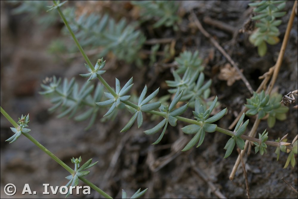Hierba perenne, hasta de 90 cm, erecto-ascendente, glabra, glauca, pruinosa. Hojas en verticilos de 6 a 8, erectas o patentes, reflejas tras la antesis. lanceoladas, oblongo-elípticas u ovadas, subobtusas o agudas, apiculadas, planas o revolutas, uninervadas, más o menos discoloras, glabras, de margen antrorso-aculeolado o liso. Inflorescencia paniculiforme, obovoidea, ovoidea o piramidal; las parciales en cimas compuestas, las de último orden con 2 o 3 flores, aglomerándose a veces en grupitos umbeliformes; pedicelos generalmente más cortos que la longitud de la corola, los fructíferos ensanchados gradualmente hacia el ápice, erectos, glabros. Flores actinomorfas, hermafroditas, tetrámeras; corola crateriforme o campanulada, glabra, blanca, de lóbulos más largos que el tubo, agudos o apiculados. Mericarpos oblongoideos o subreniformes, lisos o algo rugosos, pardos, glabros.