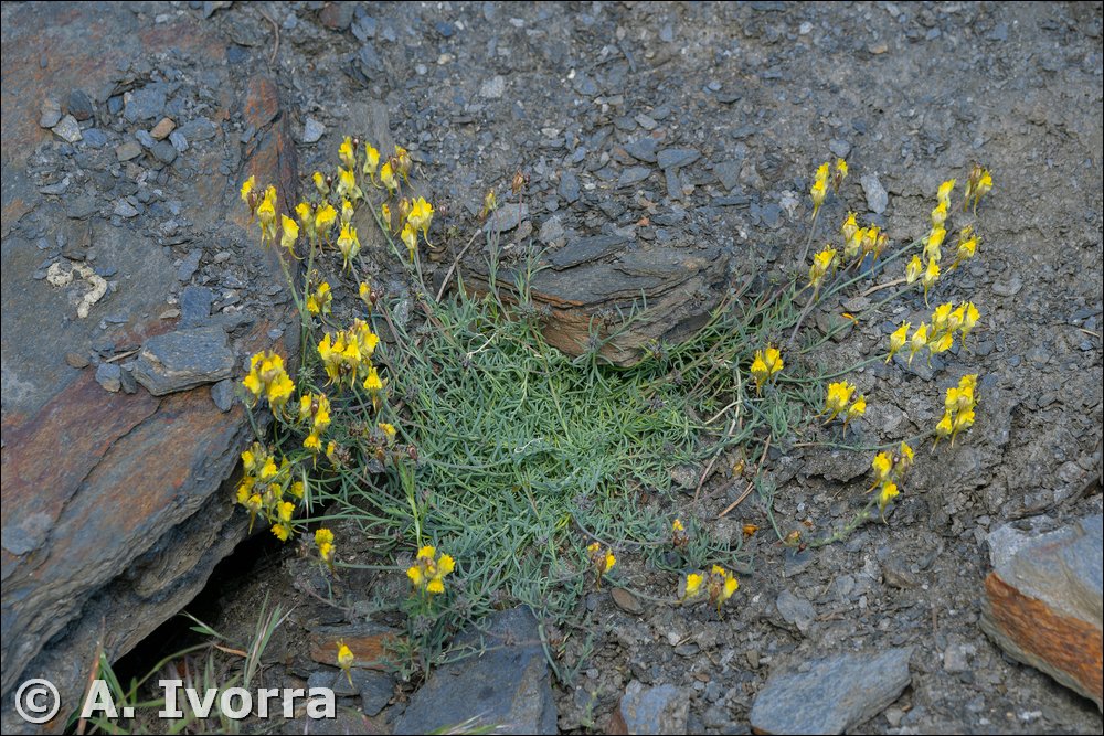 personada, espolonada, amarilla (con venas pardo-rojizas); espolón de 5-9 mm, recto o curvado, más corto o casi de la misma longitud que el resto de la corola. Androceo didínamo, con 4 estambres inclusos. Ovario súpero, bilocular, con numerosos rudimentos seminales. Fruto en cápsula, subglobosa, de unos 6 mm, que se abre por valvas hasta más de la mitad. Semillas de 1-2 mm, grisáceas.