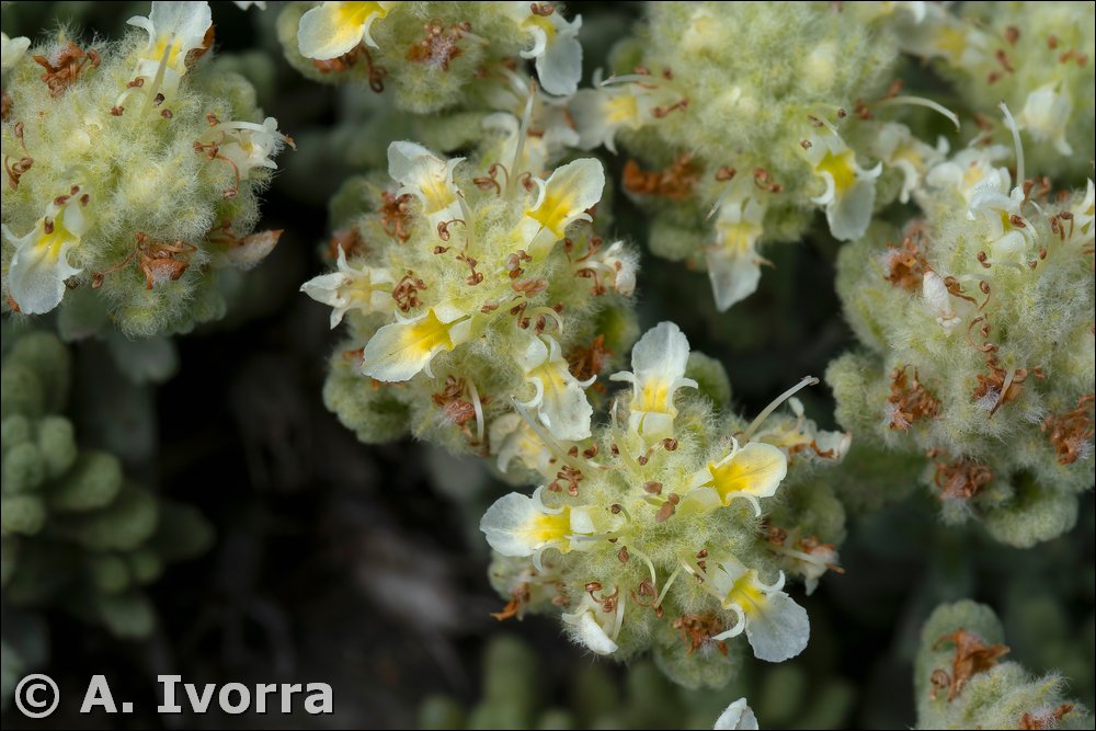 Planta sufruticosa, cespitosa o pulviniforme, con pelos ramificados largos y flexuosos. Tallos con dimorfismo estacional, los vegetativos pardo-blanquecinos y los floríferos amarillentos o amarillos. Hojas opuestas, sésiles, oblongas, cuneadas, crenadas en la mitad o en los dos tercios apicales, planas o revolutas. Inflorescencia en cabezuela terminal, oblonga. Flores zigomorfas, hermafroditas, pentámeras, sésiles. Cáliz verde o amarillo,