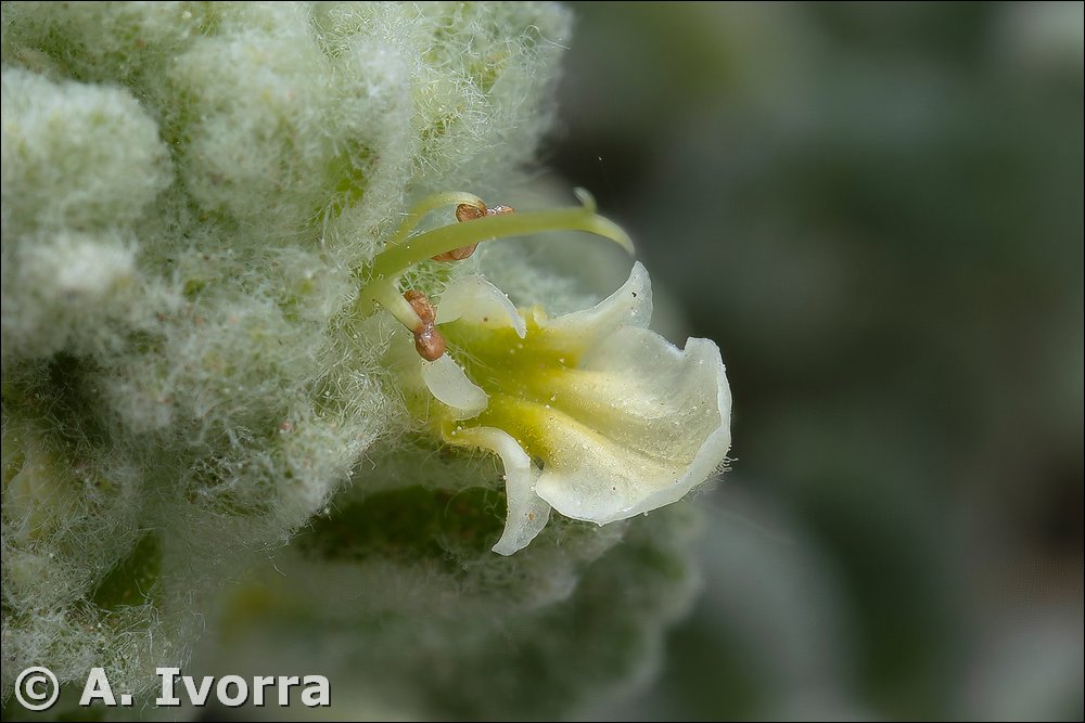 tubular. Corola unilabiada, amarilla, con 5 lóbulos. Estambres exertos con filamentos pelosos. Gineceo glabro. Núculas de 2 mm, reticuladas, glabras, de color negro o castaño.